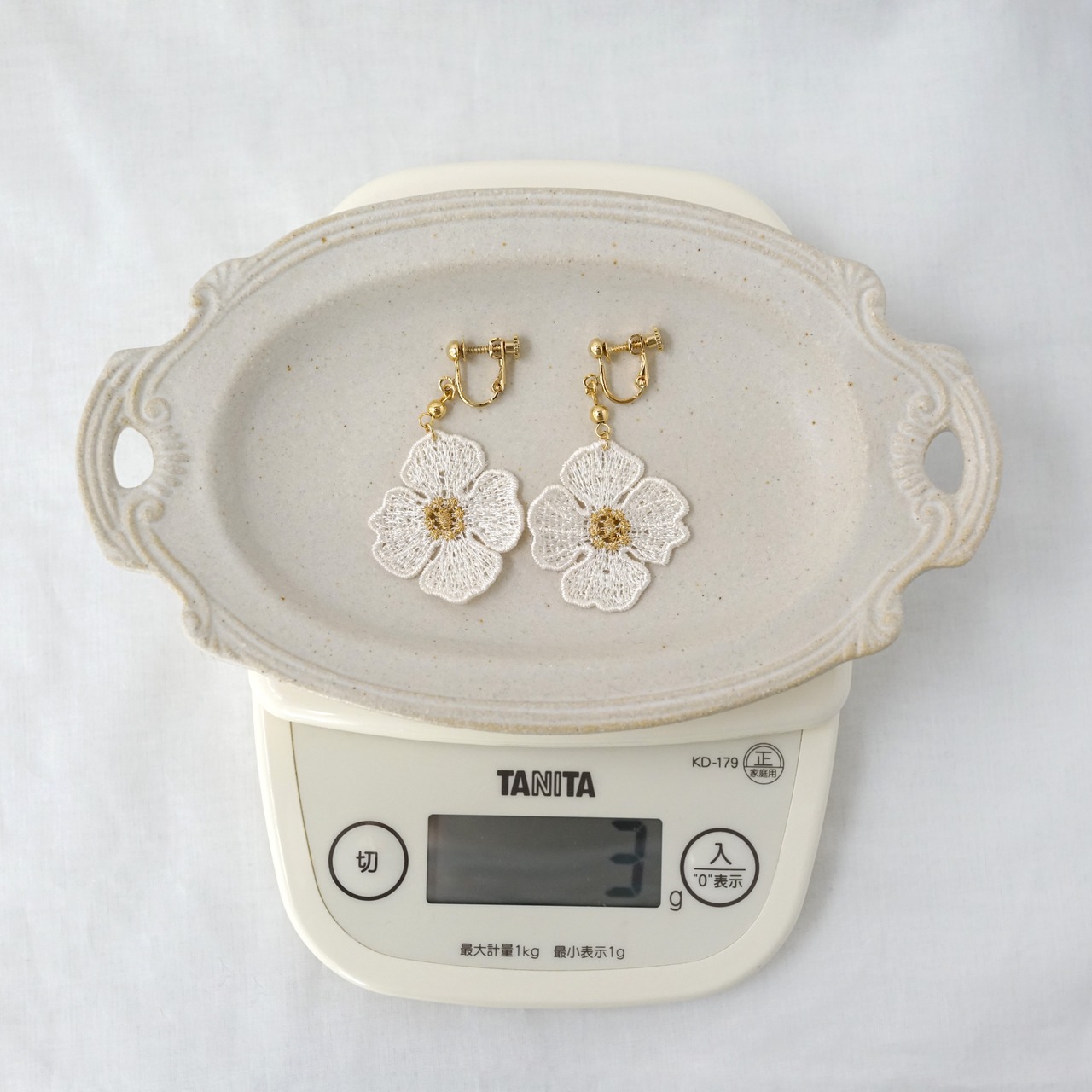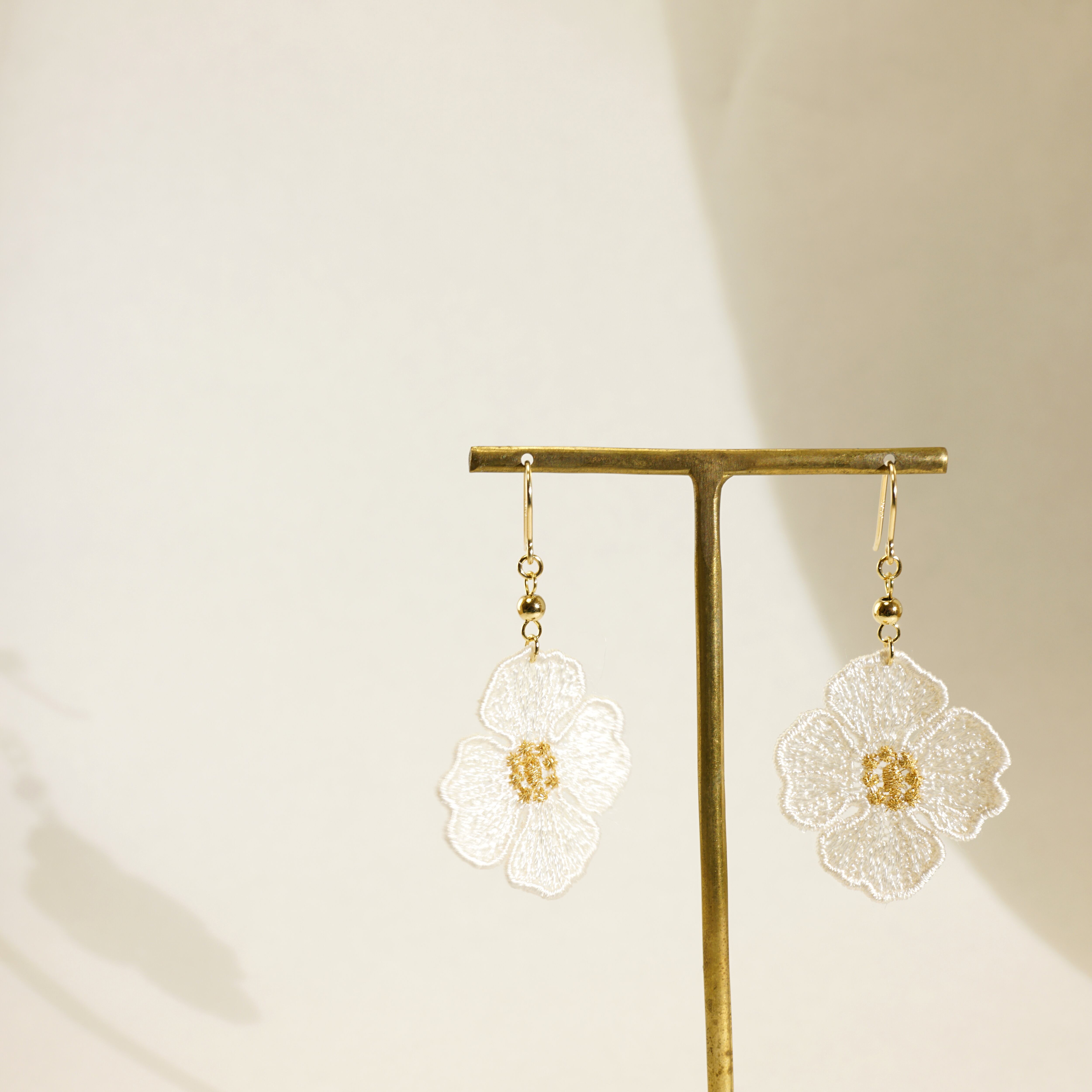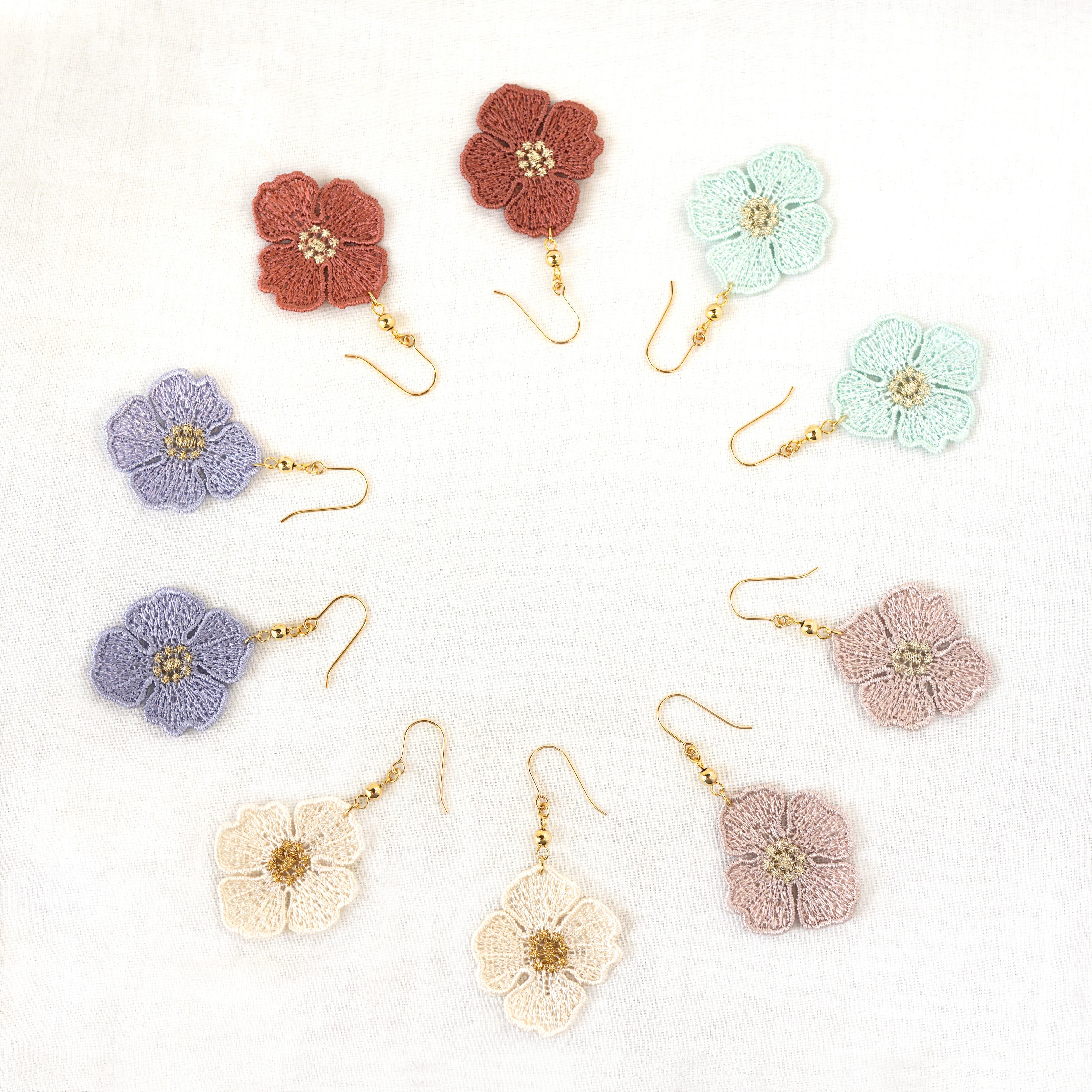刺繍の産地である群馬県桐生市で作ったオリジナルの花の刺繍を華やかな耳飾りに仕立てました。