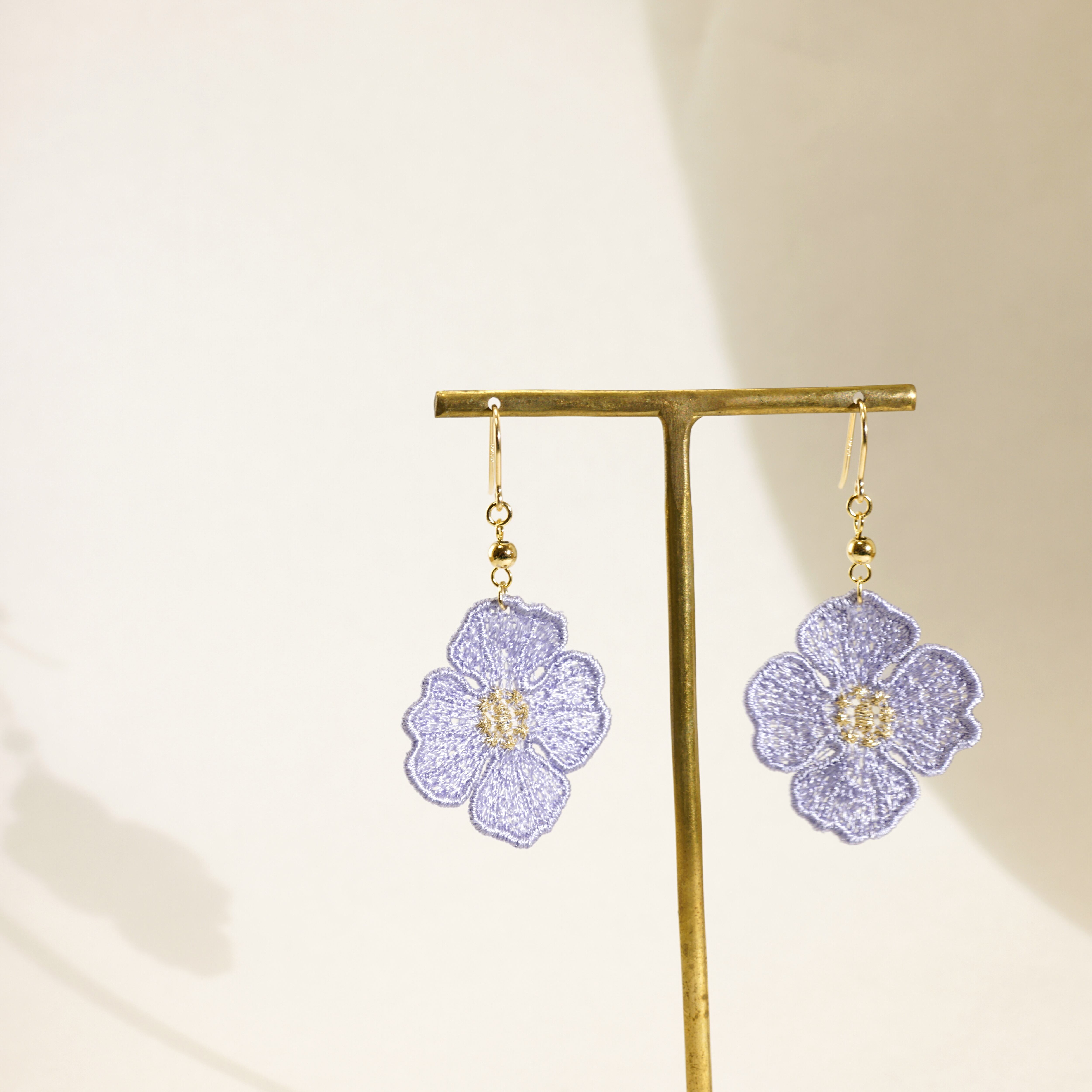 刺繍の産地である群馬県桐生市で作ったオリジナルの花の刺繍を華やかな耳飾りに仕立てました。