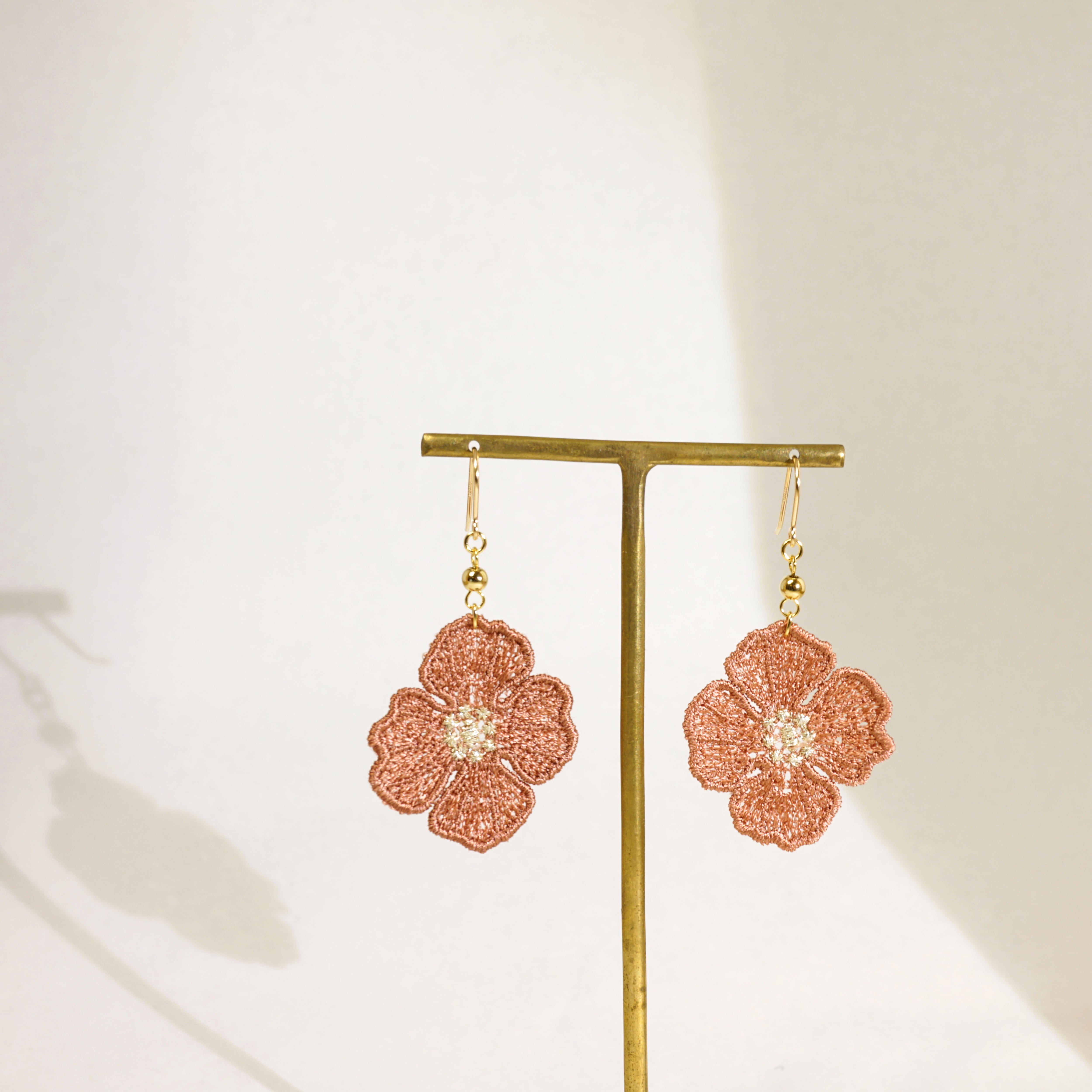 刺繍の産地である群馬県桐生市で作ったオリジナルの花の刺繍を華やかな耳飾りに仕立てました。