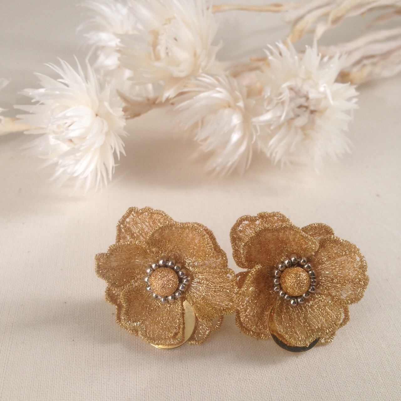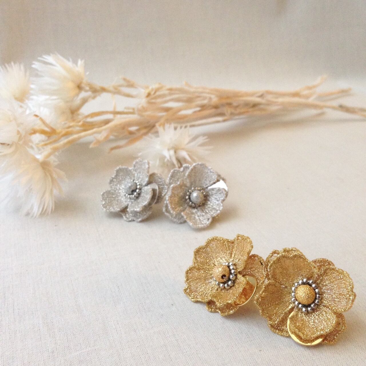 刺繍の産地である群馬県桐生市で作られたオリジナルの草花の刺繍を華やかなイヤリングに仕立てました。